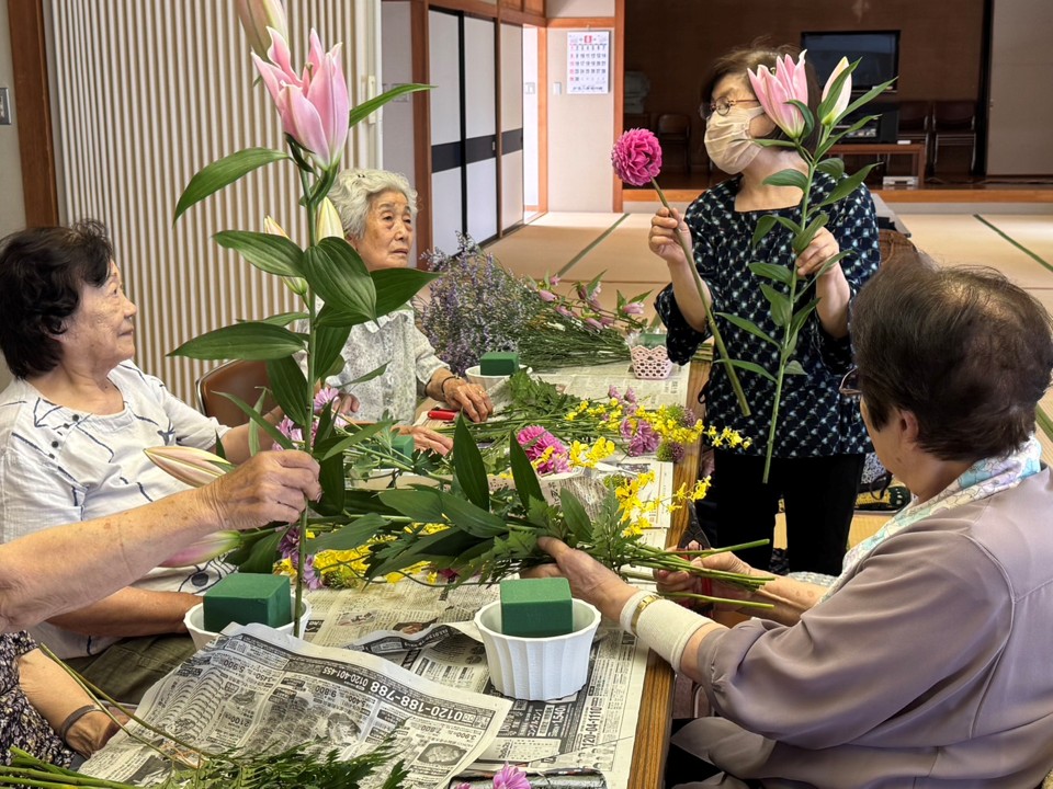 6月20日(金)に、健康館でアレンジフラワーを行いました。今回はユリをメインに、ダリア・スプレー菊・オンシジューム等を使ったアレンジフラワーを作りました♪