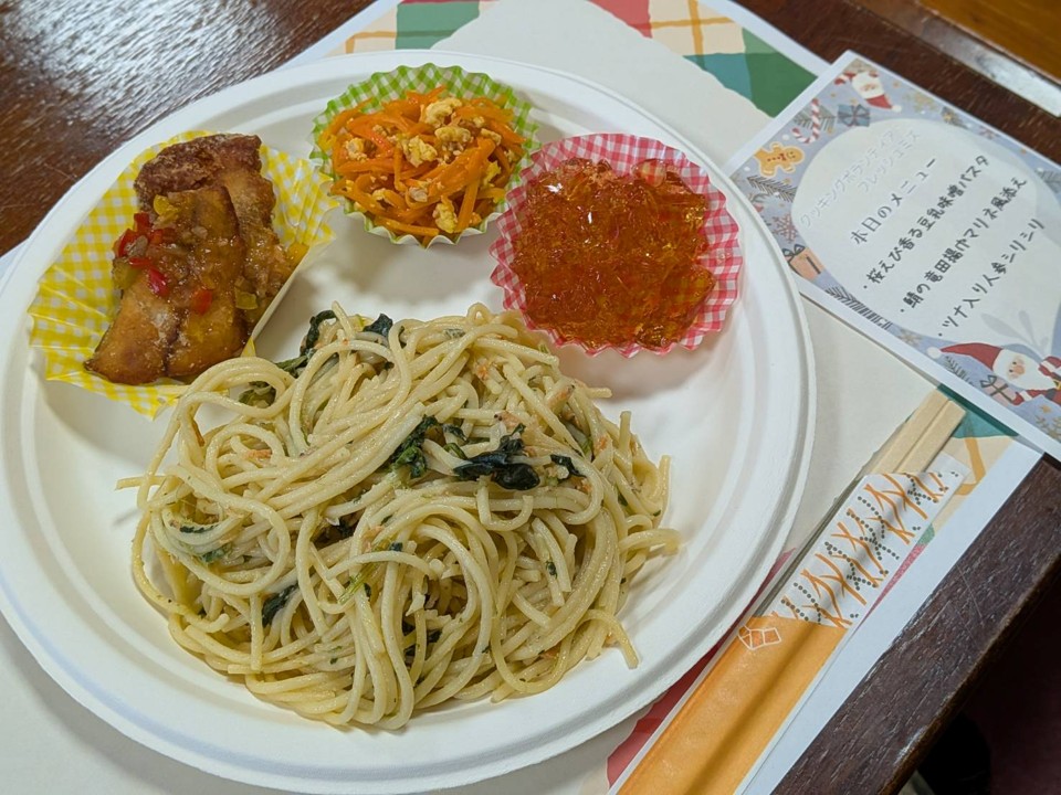 12月11日(木)に、「おしゃべり食堂」を開催しました♪今回のメニューは「桜えび香る豆乳味噌パスタ・鯖の竜田揚げマリネ風添え・ツナ入り人参シリシリ」でした。