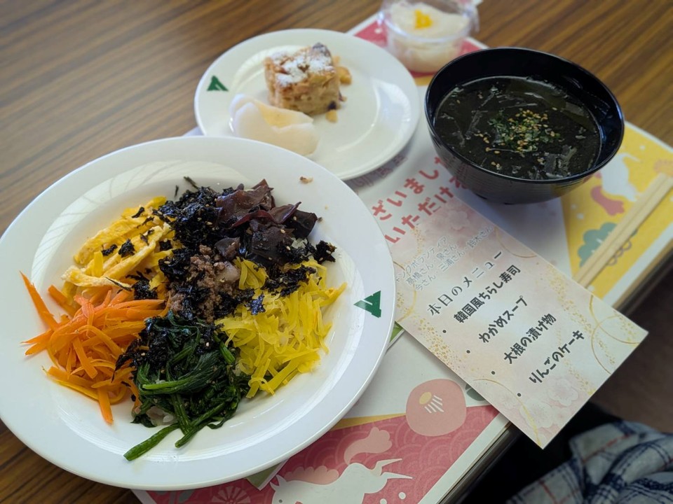 1月8日(木)に、「おしゃべり食堂」を開催しました♪今回のメニューは「韓国風ちらし寿司・わかめスープ・大根の漬け物・りんごのケーキ」でした。